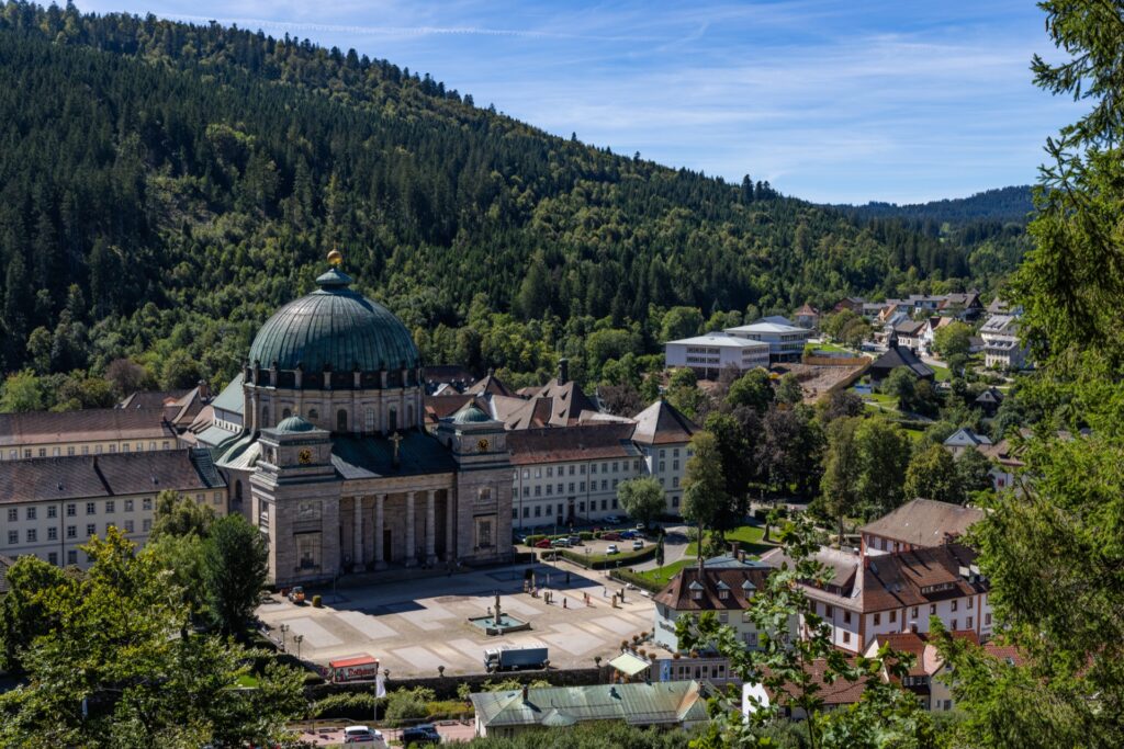 The next day, we stayed closer to our base in Ibach and set out to explore St. Blasien. We began with a peaceful walk to the Windberg Waterfall, tucked away in a lush, quiet corner of the forest. From there, we strolled into town to visit the impressive Dom, its grand white dome rising unexpectedly in the middle of the valley—a surprising and beautiful sight. To cap off the day, we climbed to a scenic viewpoint marked by a large cross. From the top, we had a sweeping view over the town and the surrounding hills, bathed in warm afternoon light.